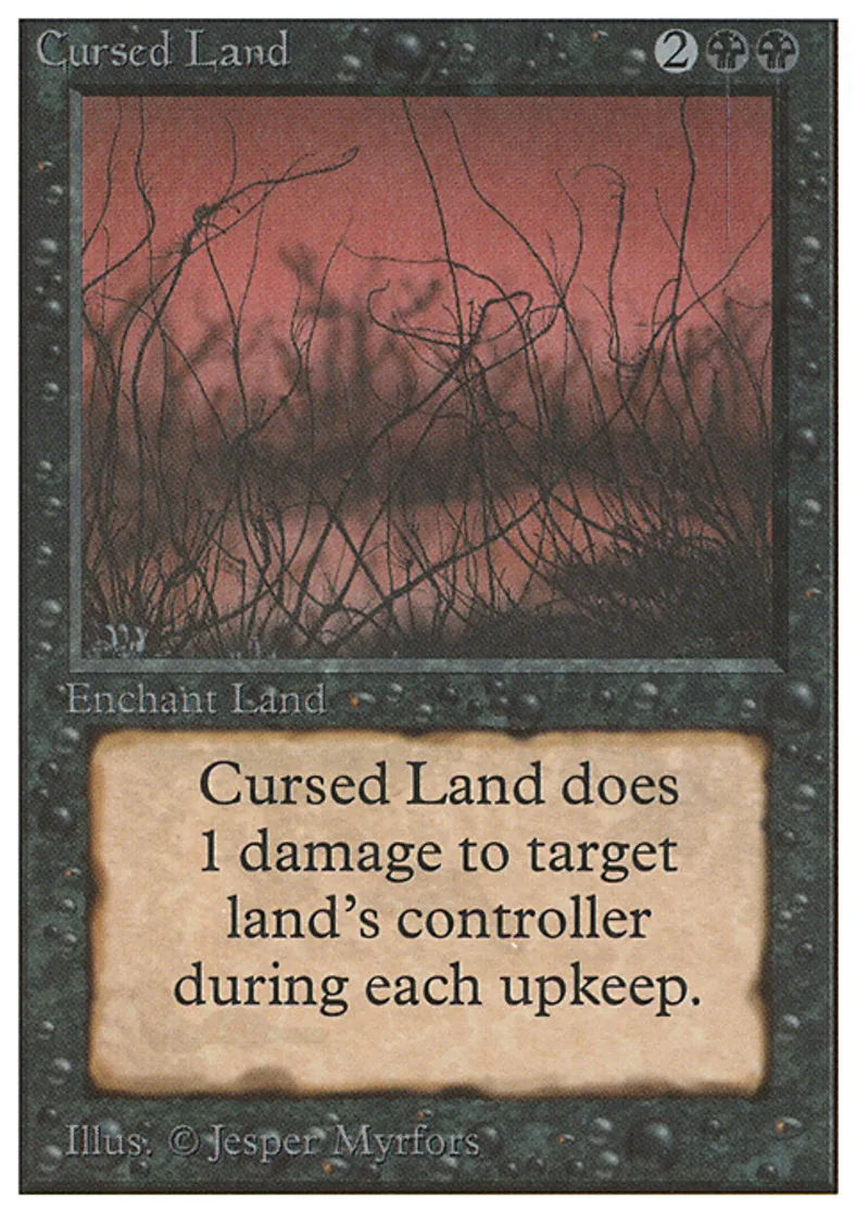 | Oracle Text | Enchant land At the beginning of the upkeep of enchanted land's controller, Cursed Land deals 1 damage to that player. | ||