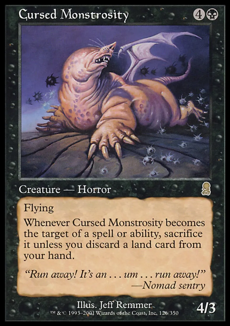 | Oracle Text | Flying Whenever Cursed Monstrosity becomes the target of a spell or ability, sacrifice it unless you discard a land card. | ||