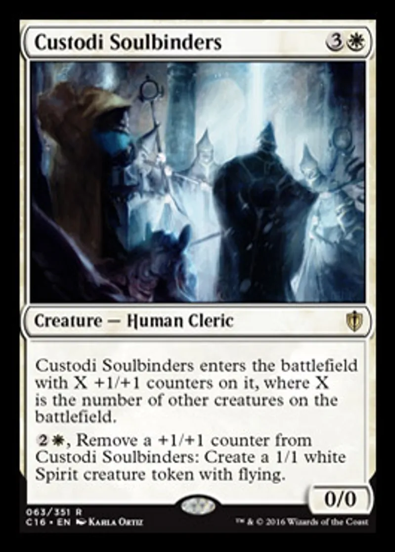 | Oracle Text | Custodi Soulbinders enters the battlefield with X +1/+1 counters on it, where X is the number of other creatures on the battlefield. {{2}}{{w}}, Remove a +1/+1 counter from Custodi Soulbinders: Create a 1/1 white Spirit creature token with flying. | ||