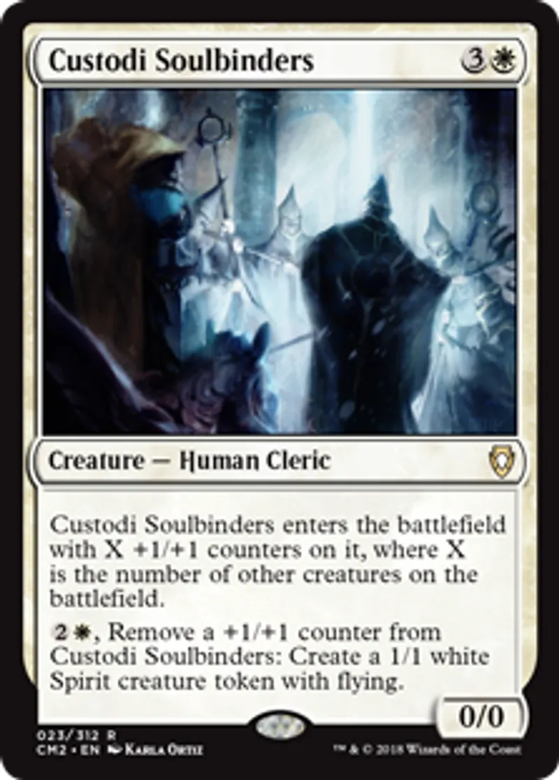 | Oracle Text | Custodi Soulbinders enters the battlefield with X +1/+1 counters on it, where X is the number of other creatures on the battlefield. {{2}}{{w}}, Remove a +1/+1 counter from Custodi Soulbinders: Create a 1/1 white Spirit creature token with flying. | ||