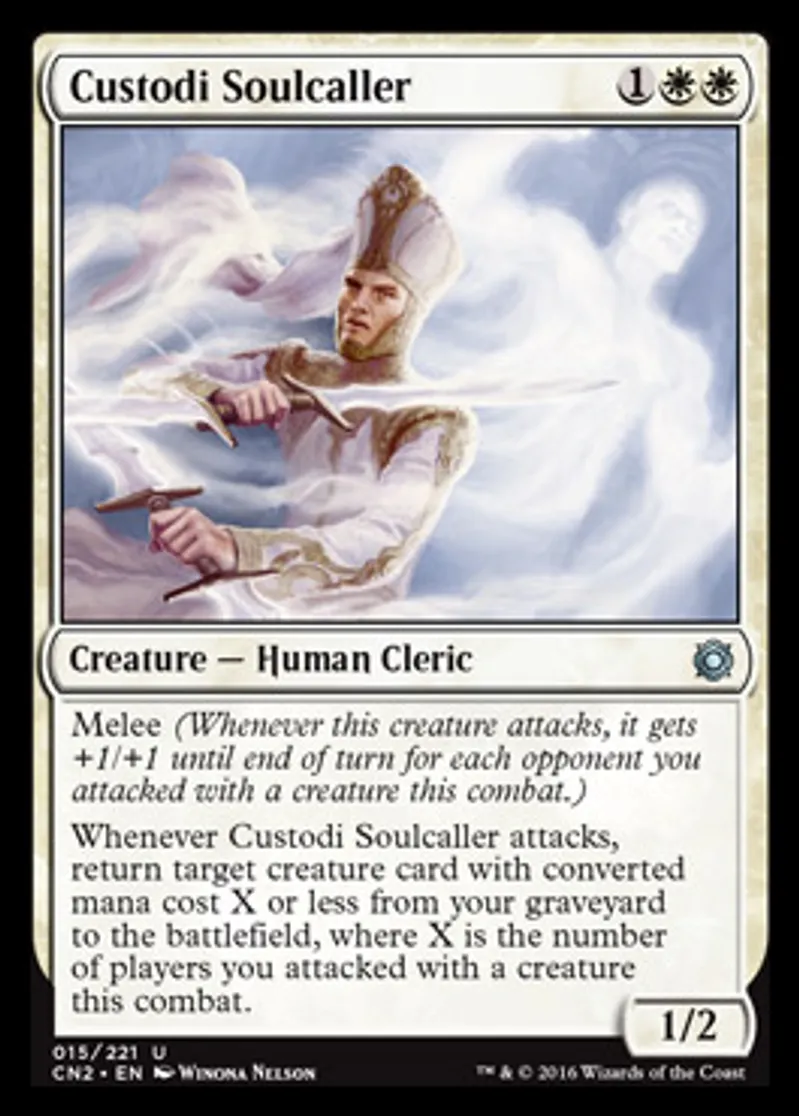 | Oracle Text | Melee (Whenever this creature attacks, it gets +1/+1 until end of turn for each opponent you attacked with a creature this combat.) Whenever Custodi Soulcaller attacks, return target creature card with converted mana cost X or less from your graveyard to the battlefield, where X is the number of players you attacked with a creature this combat. | ||
