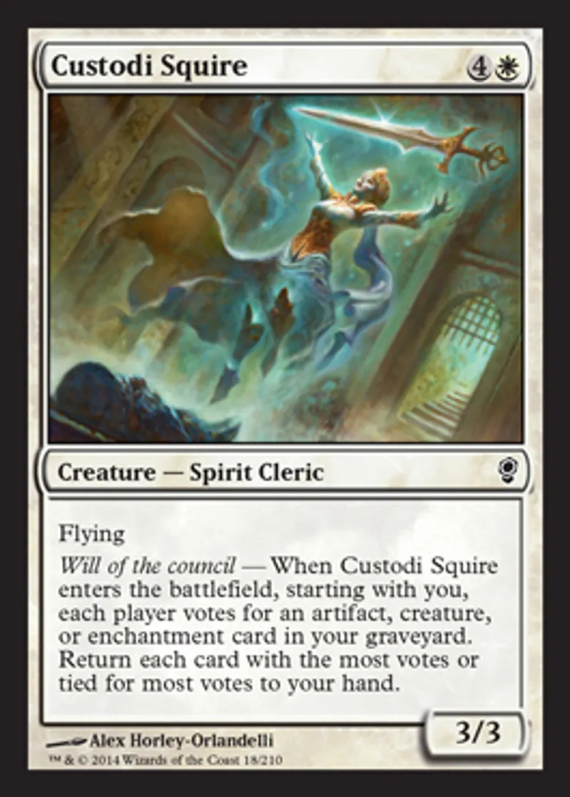 | Oracle Text | Flying Will of the council — When Custodi Squire enters the battlefield, starting with you, each player votes for an artifact, creature, or enchantment card in your graveyard. Return each card with the most votes or tied for most votes to your hand. | ||