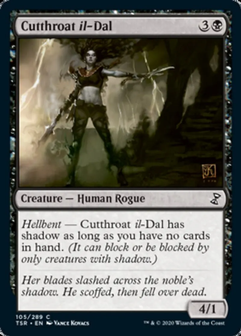 | Oracle Text | Hellbent — Cutthroat il-Dal has shadow as long as you have no cards in hand. (It can block or be blocked by only creatures with shadow.) | ||