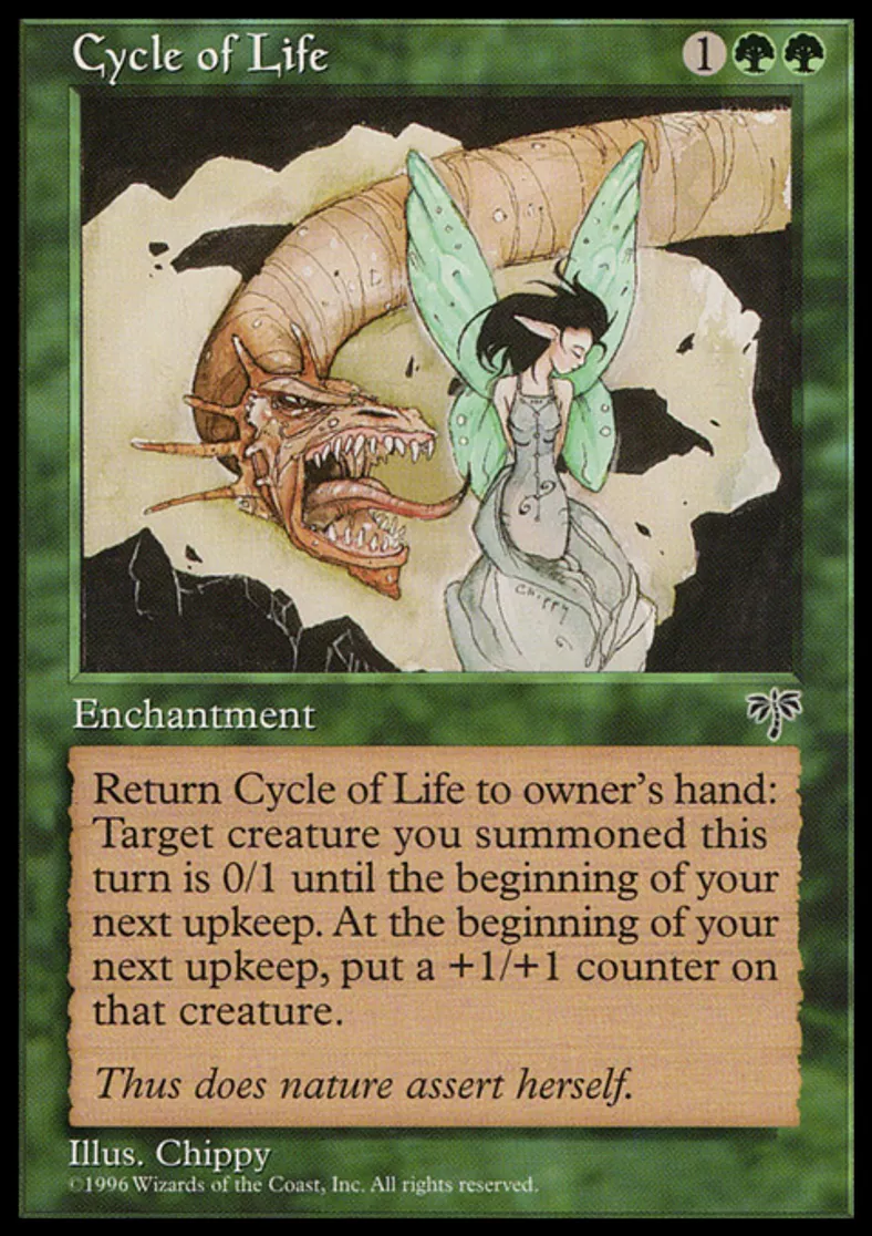 | Oracle Text | Return Cycle of Life to its owner's hand: Target creature you cast this turn becomes 0/1 until your next upkeep. At the beginning of your next upkeep, put a +1/+1 counter on that creature. | ||