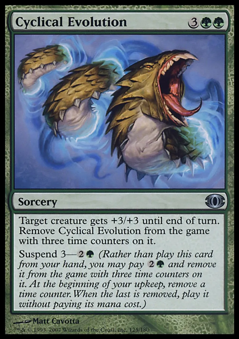| Oracle Text | Target creature gets +3/+3 until end of turn. Exile Cyclical Evolution with three time counters on it. Suspend 3—{{2}}{{g}} (Rather than cast this card from your hand, you may pay {{2}}{{g}} and exile it with three time counters on it. At the beginning of your upkeep, remove a time counter. When the last is removed, cast it without paying its mana cost.) | ||