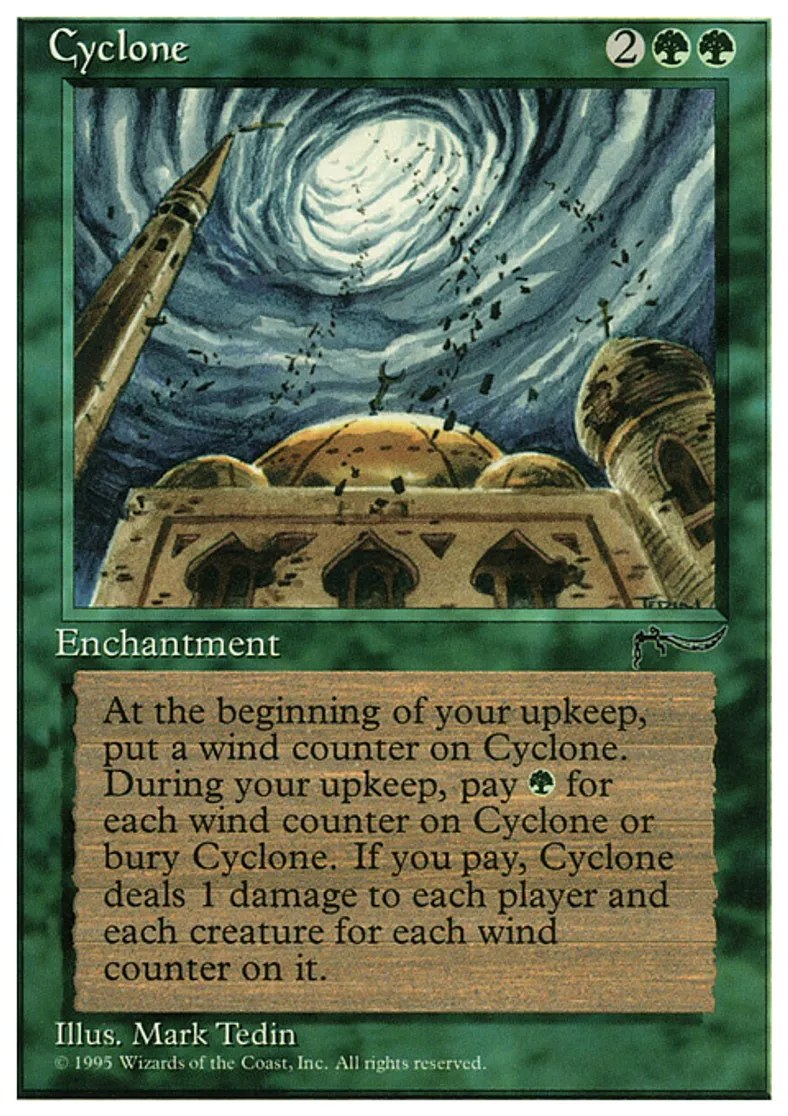 | Oracle Text | At the beginning of your upkeep, put a wind counter on Cyclone, then sacrifice Cyclone unless you pay {{g}} for each wind counter on it. If you pay, Cyclone deals damage equal to the number of wind counters on it to each creature and each player. | ||