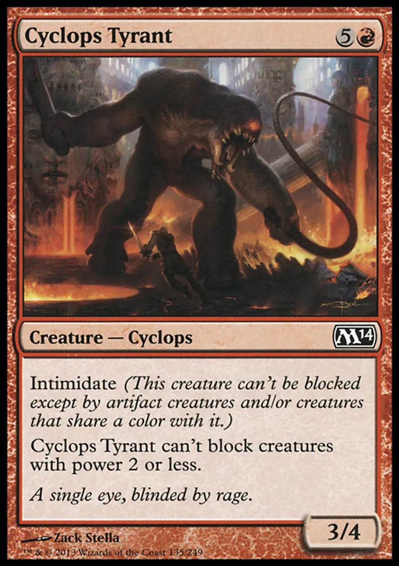 | Oracle Text | Intimidate (This creature can't be blocked except by artifact creatures and/or creatures that share a color with it.) Cyclops Tyrant can't block creatures with power 2 or less. | ||