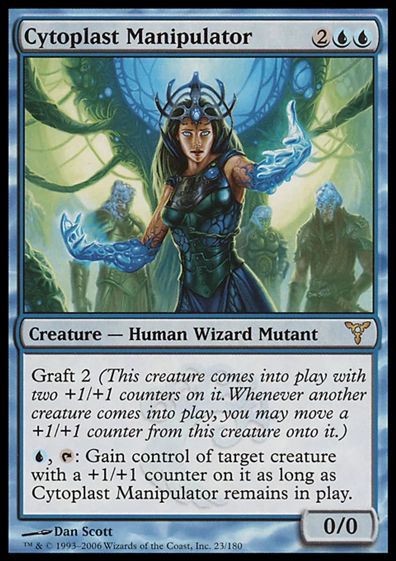 | Oracle Text | Graft 2 (This creature enters the battlefield with two +1/+1 counters on it. Whenever another creature enters the battlefield, you may move a +1/+1 counter from this creature onto it.) {{u}}, {{t}}: Gain control of target creature with a +1/+1 counter on it for as long as Cytoplast Manipulator remains on the battlefield. | ||