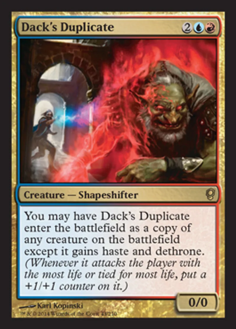 | Oracle Text | You may have Dack's Duplicate enter the battlefield as a copy of any creature on the battlefield except it gains haste and dethrone. (Whenever it attacks the player with the most life or tied for most life, put a +1/+1 counter on it.) | ||