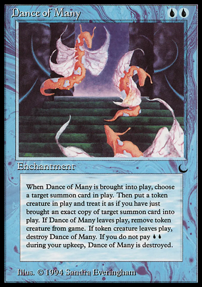 | Oracle Text | When Dance of Many enters the battlefield, put a token that's a copy of target nontoken creature onto the battlefield. When Dance of Many leaves the battlefield, exile the token. When the token leaves the battlefield, sacrifice Dance of Many. At the beginning of your upkeep, sacrifice Dance of Many unless you pay {{u}}{{u}}. | ||