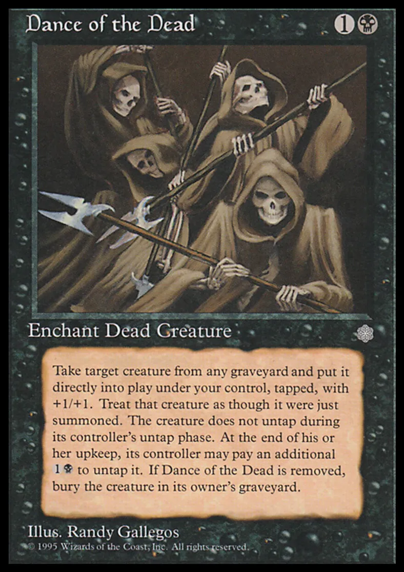| Oracle Text | Enchant creature card in a graveyard When Dance of the Dead enters the battlefield, if it's on the battlefield, it loses "enchant creature card in a graveyard" and gains "enchant creature put onto the battlefield with Dance of the Dead." Return enchanted creature card to the battlefield tapped under your control and attach Dance of the Dead to it. When Dance of the Dead leaves the battlefield, that creature's controller sacrifices it. Enchanted creature gets +1/+1 and doesn't untap during its controller's untap step. At the beginning of the upkeep of enchanted creature's controller, that player may pay {{1}}{{b}}. If he or she does, untap that creature. | ||