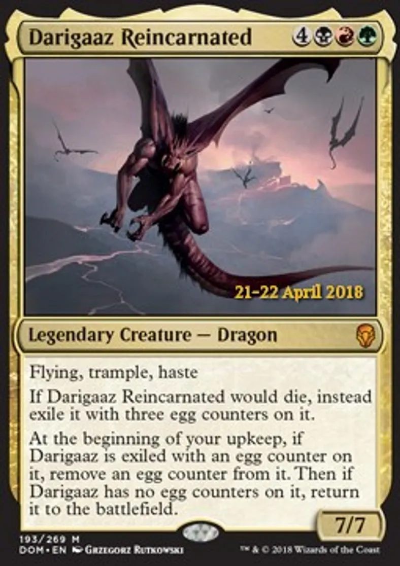 | Oracle Text | Flying, trample, haste If Darigaaz Reincarnated would die, instead exile it with three egg counters on it. At the beginning of your upkeep, if Darigaaz is exiled with an egg counter on it, remove an egg counter from it. Then if Darigaaz has no egg counters on it, return it to the battlefield. | ||