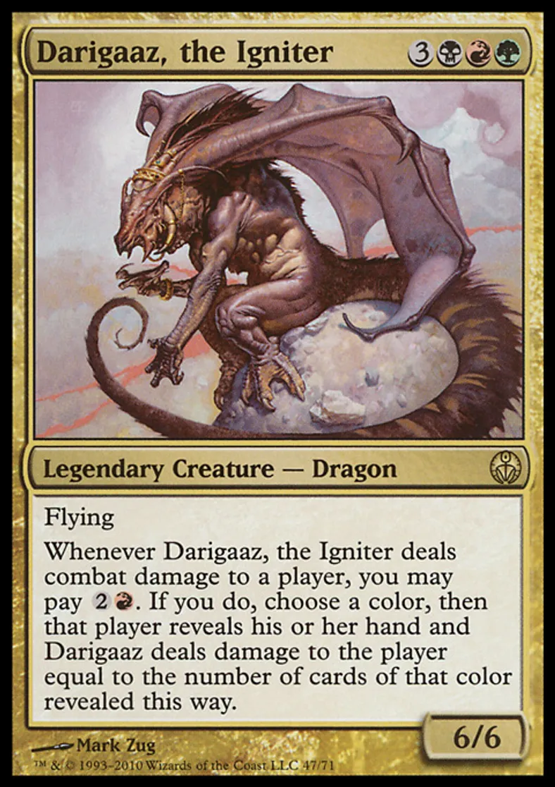 | Oracle Text | Flying Whenever Darigaaz, the Igniter deals combat damage to a player, you may pay {{2}}{{r}}. If you do, choose a color, then that player reveals his or her hand and Darigaaz deals damage to the player equal to the number of cards of that color revealed this way. | ||