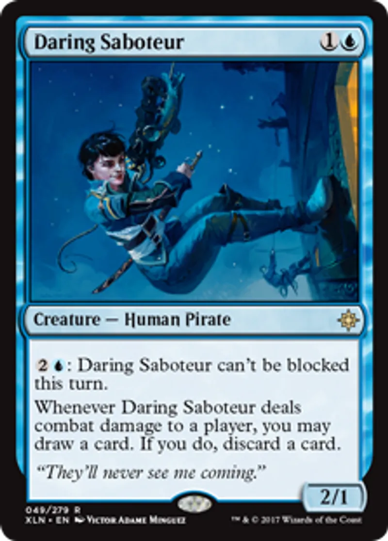 | Oracle Text | {{2}}{{u}}: Daring Saboteur can't be blocked this turn. Whenever Daring Saboteur deals combat damage to a player, you may draw a card. If you do, discard a card. | ||