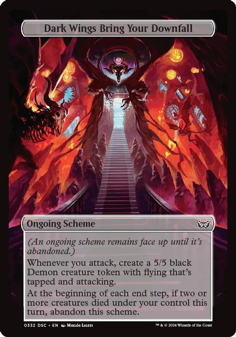 whenever you attack, create a 5/5 black demon creature token with flying that’s tapped and attacking. at the beginning of each end step, if two or more creatures died under your control this turn, abandon this scheme. | ||