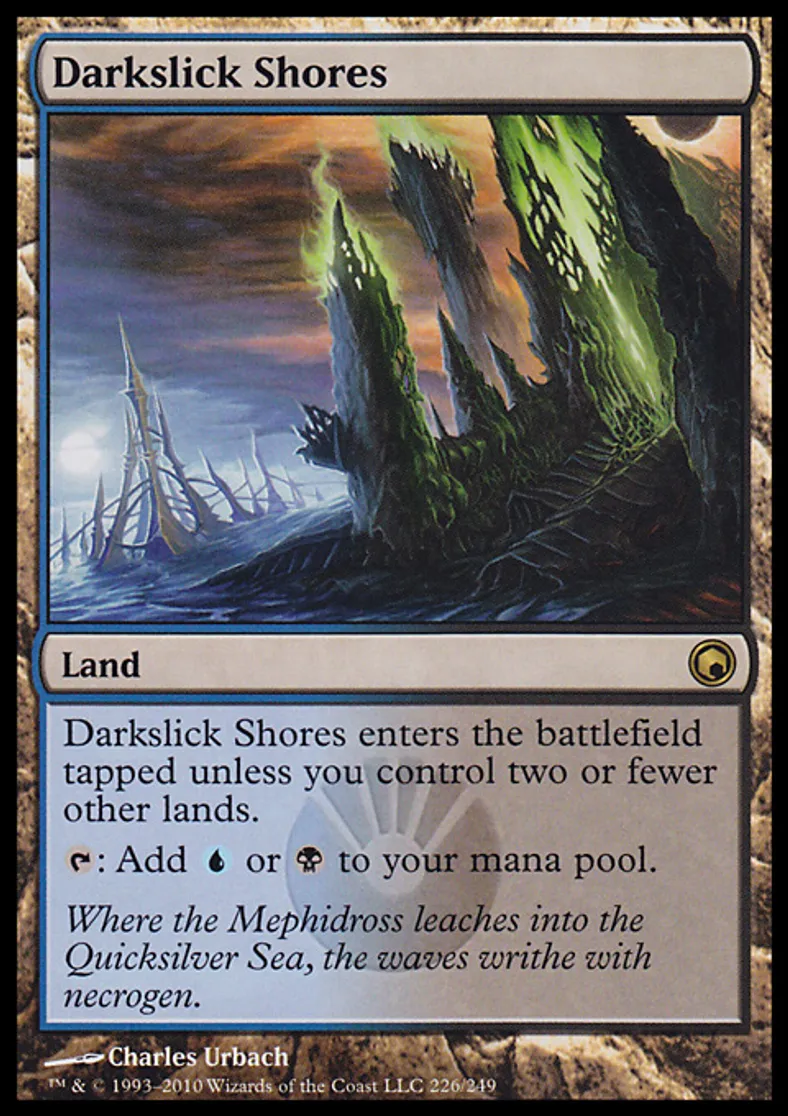 | Oracle Text | Darkslick Shores enters the battlefield tapped unless you control two or fewer other lands. {{t}}: Add {{u}} or {{b}} to your mana pool. | ||
