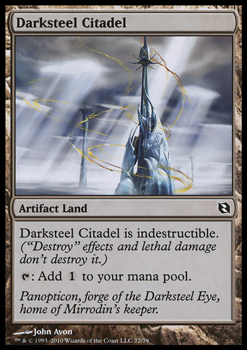 | Oracle Text | Darksteel Citadel is indestructible. ("Destroy" effects and lethal damage don't destroy it.) {{t}}: Add {{1}} to your mana pool. | ||