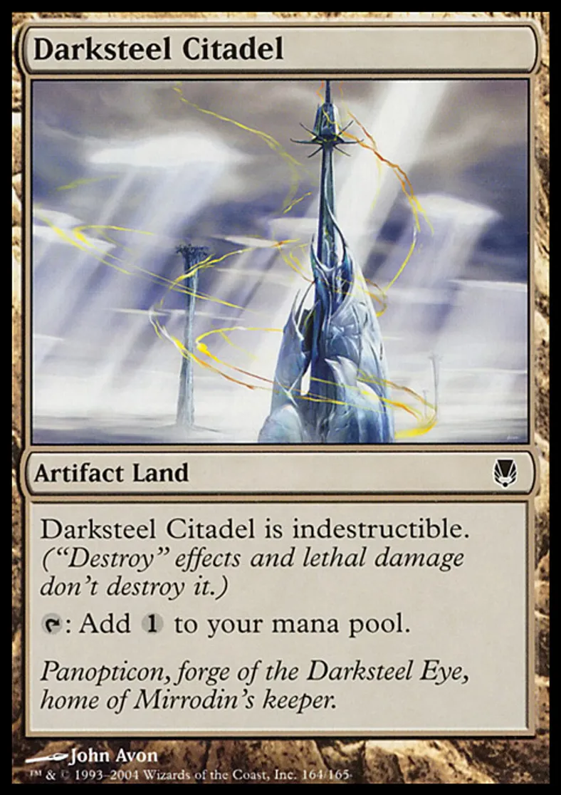 | Oracle Text | Darksteel Citadel is indestructible. ("Destroy" effects and lethal damage don't destroy it.) {{t}}: Add {{1}} to your mana pool. | ||