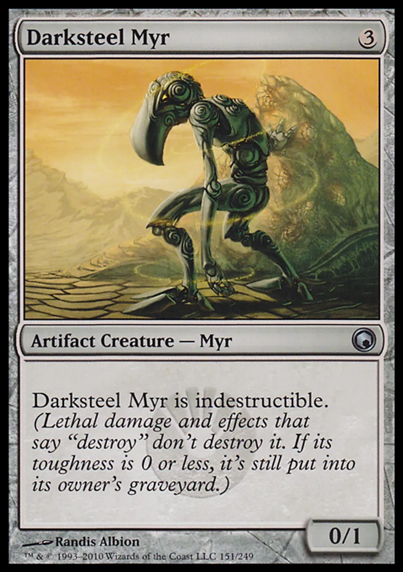 | Oracle Text | Darksteel Myr is indestructible. (Lethal damage and effects that say "destroy" don't destroy it. If its toughness is 0 or less, it's still put into its owner's graveyard.) | ||