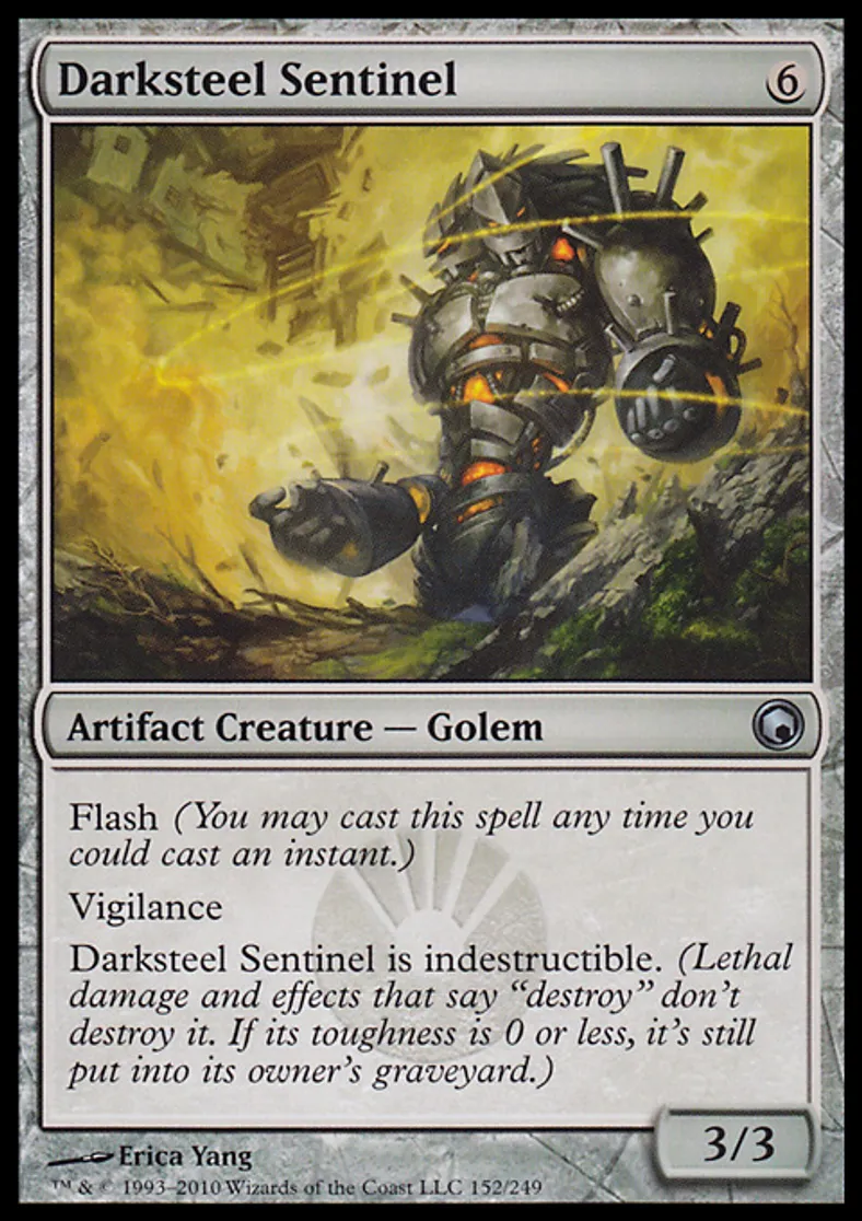 | Oracle Text | Flash (You may cast this spell any time you could cast an instant.) Vigilance Darksteel Sentinel is indestructible. (Lethal damage and effects that say "destroy" don't destroy it. If its toughness is 0 or less, it's still put into its owner's graveyard.) | ||