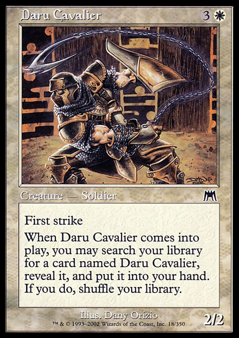 | Oracle Text | First strike When Daru Cavalier enters the battlefield, you may search your library for a card named Daru Cavalier, reveal it, and put it into your hand. If you do, shuffle your library. | ||