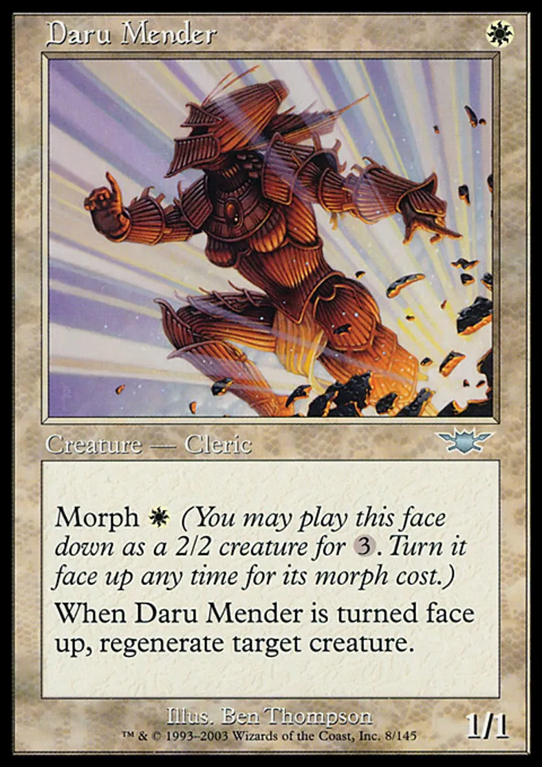| Oracle Text | Morph {{w}} (You may cast this face down as a 2/2 creature for {{3}}. Turn it face up any time for its morph cost.) When Daru Mender is turned face up, regenerate target creature. | ||