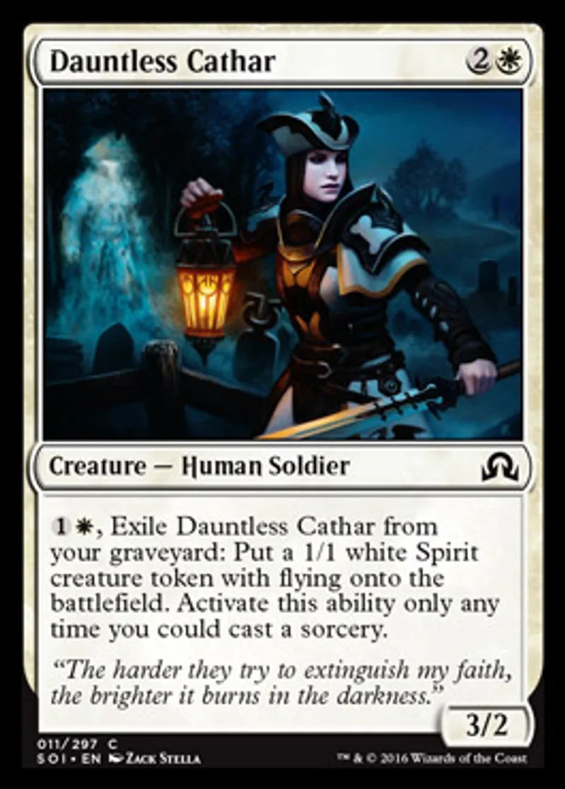 | Oracle Text | {{1}}{{w}}, Exile Dauntless Cathar from your graveyard: Put a 1/1 white Spirit creature token with flying onto the battlefield. Activate this ability only any time you could cast a sorcery. | ||