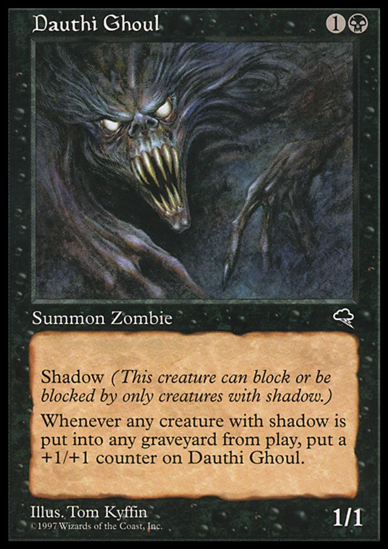 | Oracle Text | Shadow (This creature can block or be blocked by only creatures with shadow.) Whenever a creature with shadow dies, put a +1/+1 counter on Dauthi Ghoul. | ||