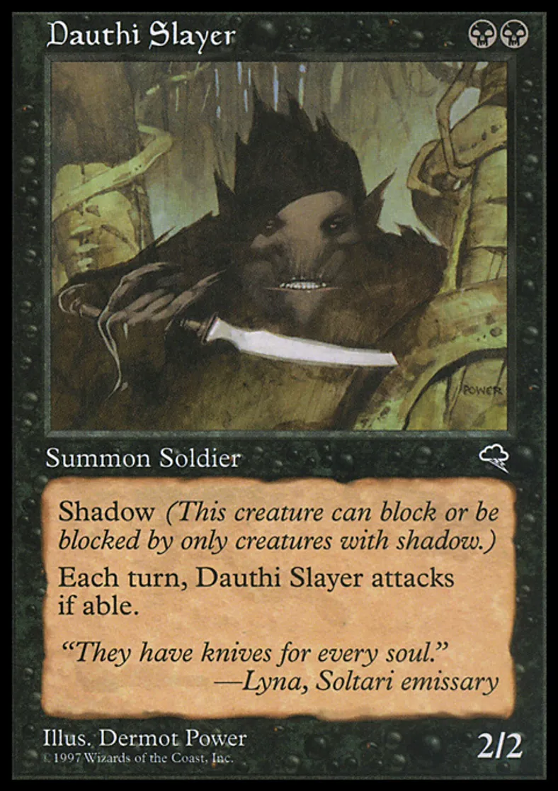 | Oracle Text | Shadow (This creature can block or be blocked by only creatures with shadow.) Dauthi Slayer attacks each turn if able. | ||