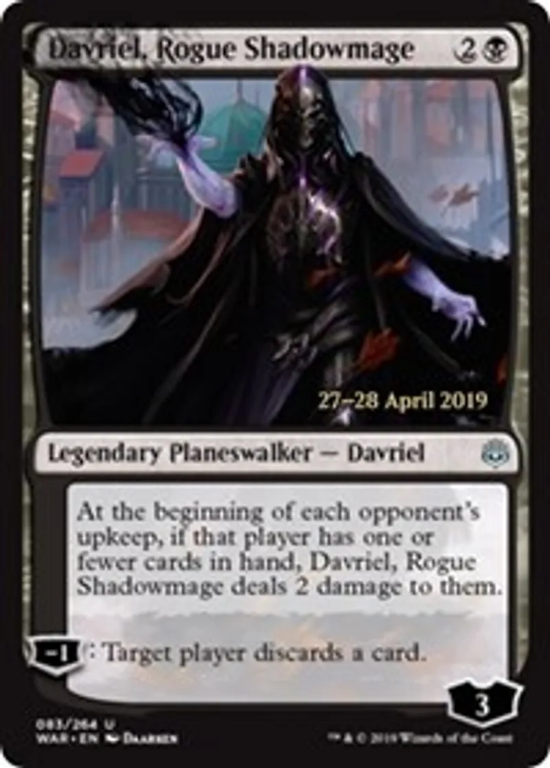 | Oracle Text | At the beginning of each opponent's upkeep, if that player has one or fewer cards in hand, Davriel, Rogue Shadowmage deals 2 damage to them.