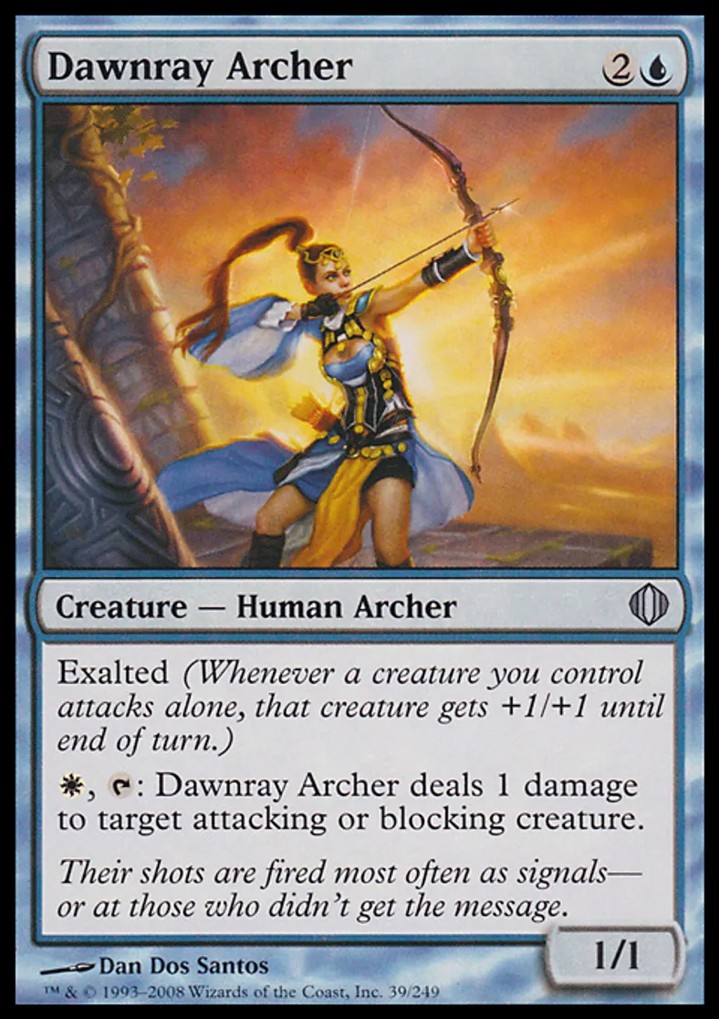 | Oracle Text | Exalted (Whenever a creature you control attacks alone, that creature gets +1/+1 until end of turn.) {{w}}, {{t}}: Dawnray Archer deals 1 damage to target attacking or blocking creature. | ||