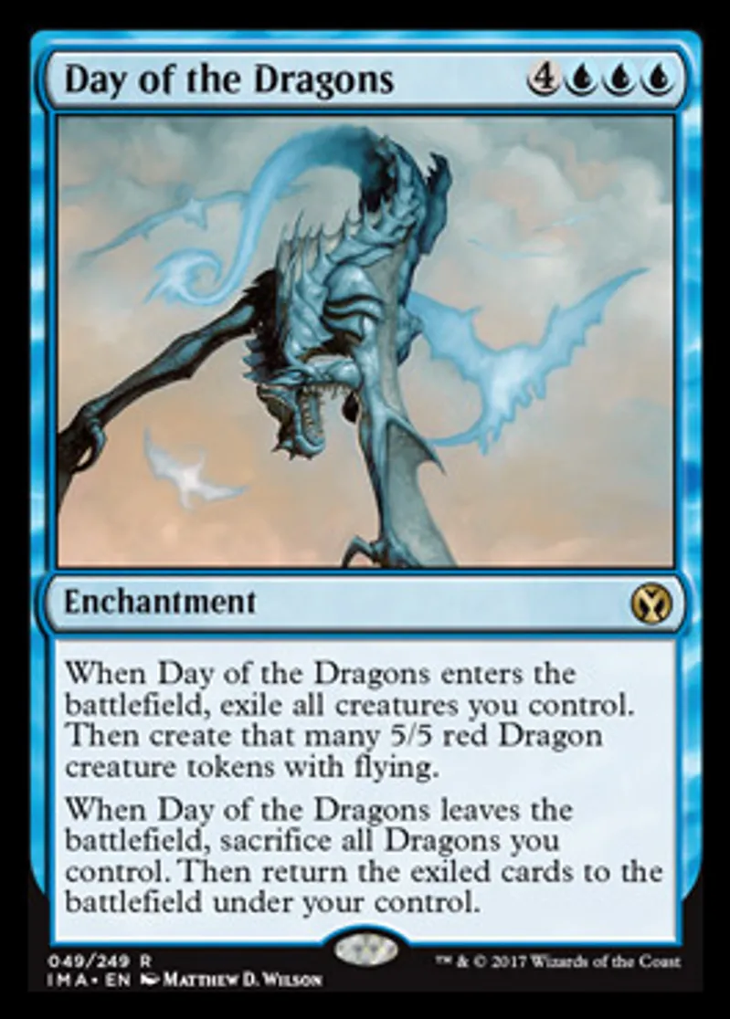 | Oracle Text | When Day of the Dragons enters the battlefield, exile all creatures you control. Then create that many 5/5 red Dragon creature tokens with flying. When Day of the Dragons leaves the battlefield, sacrifice all Dragons you control. Then return the exiled cards to the battlefield under your control. | ||