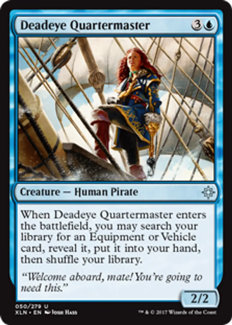 | Oracle Text | When Deadeye Quartermaster enters the battlefield, you may search your library for an Equipment or Vehicle card, reveal it, put it into your hand, then shuffle your library. | ||
