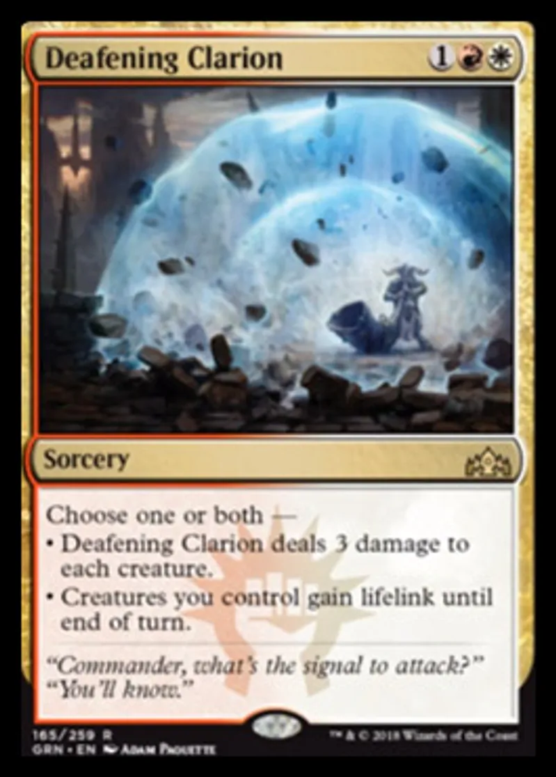 | Oracle Text | Choose one or both — • Deafening Clarion deals 3 damage to each creature. • Creatures you control gain lifelink until end of turn. | ||