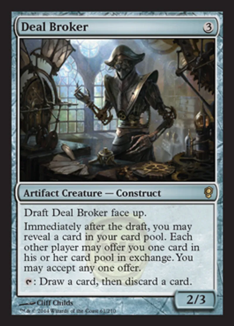 | Oracle Text | Draft Deal Broker face up. Immediately after the draft, you may reveal a card in your card pool. Each other player may offer you one card in his or her card pool in exchange. You may accept any one offer. {{t}}: Draw a card, then discard a card. | ||