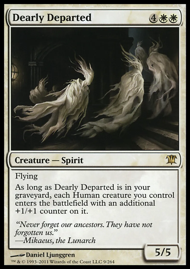| Oracle Text | Flying As long as Dearly Departed is in your graveyard, each Human creature you control enters the battlefield with an additional +1/+1 counter on it. | ||