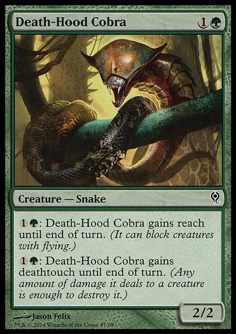| Oracle Text | {1}{G}: Death-Hood Cobra gains reach until end of turn. (It can block creatures with flying.)