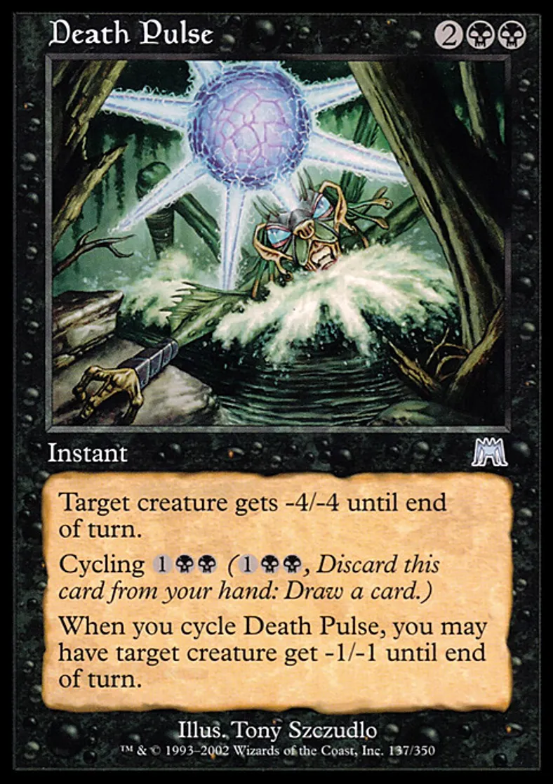 | Oracle Text | Target creature gets -4/-4 until end of turn. Cycling {{1}}{{b}}{{b}} ({{1}}{{b}}{{b}}, Discard this card: Draw a card.) When you cycle Death Pulse, you may have target creature get -1/-1 until end of turn. | ||