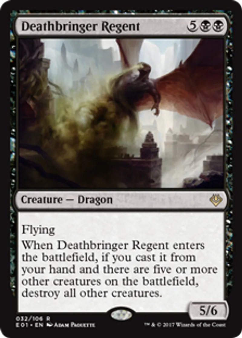 | Oracle Text | Flying When Deathbringer Regent enters the battlefield, if you cast it from your hand and there are five or more other creatures on the battlefield, destroy all other creatures. | ||