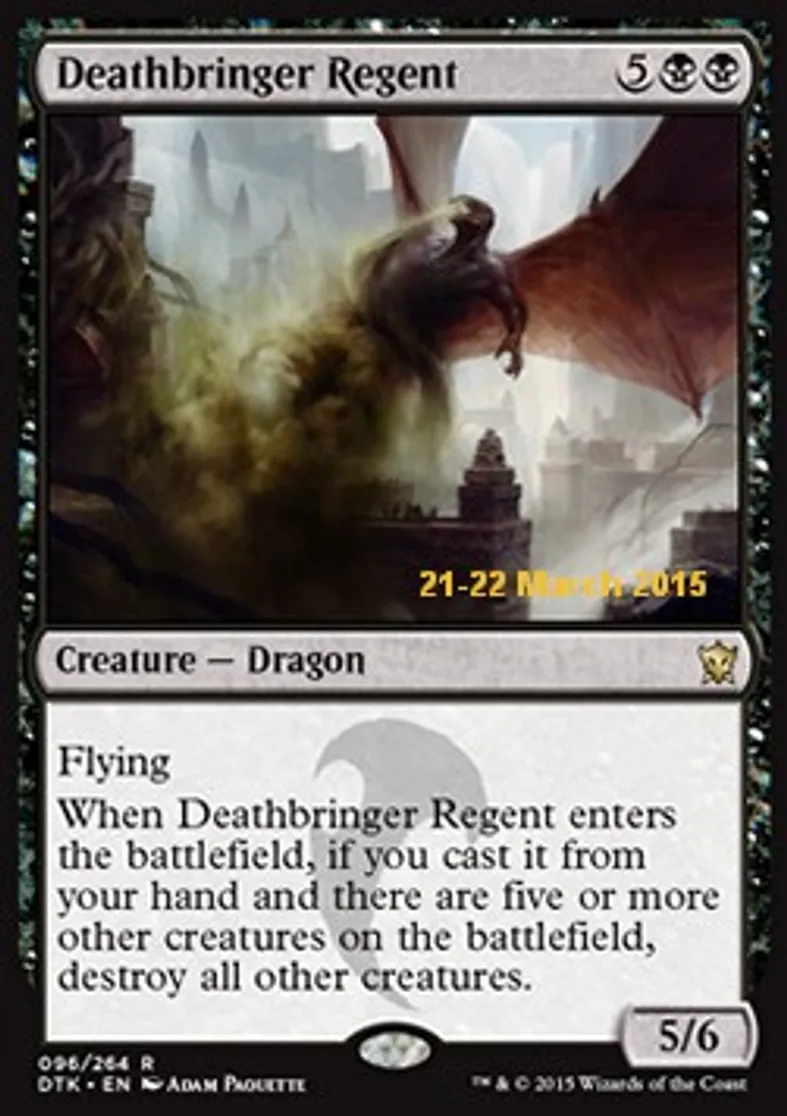 | Oracle Text | Flying When Deathbringer Regent enters the battlefield, if you cast it from your hand and there are five or more other creatures on the battlefield, destroy all other creatures. | ||
