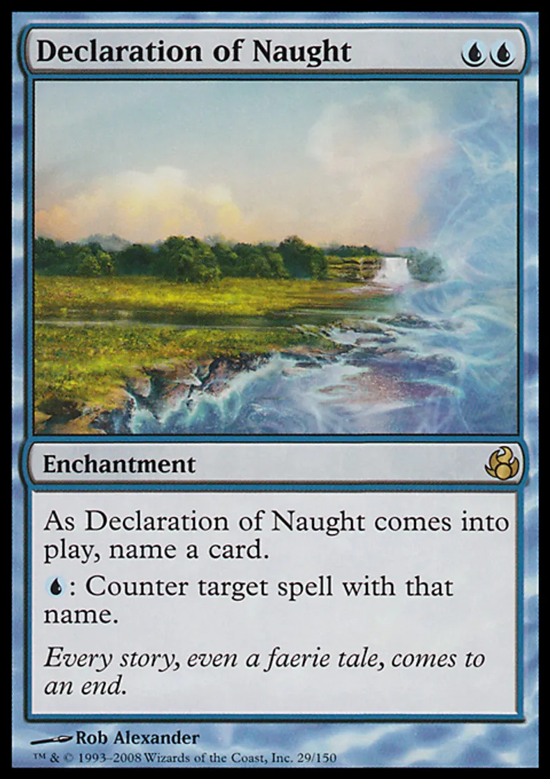 | Oracle Text | As Declaration of Naught enters the battlefield, name a card. {{u}}: Counter target spell with the chosen name. | ||