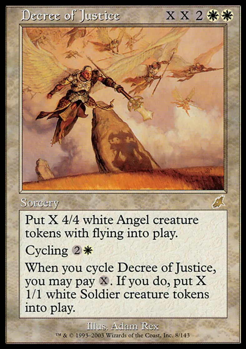 | Oracle Text | Put X 4/4 white Angel creature tokens with flying onto the battlefield. Cycling {{2}}{{w}} ({{2}}{{w}}, Discard this card: Draw a card.) When you cycle Decree of Justice, you may pay {{x}}. If you do, put X 1/1 white Soldier creature tokens onto the battlefield. | ||