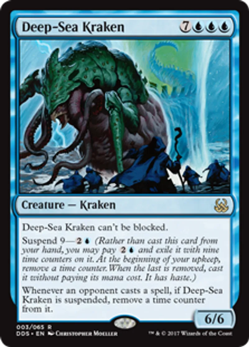 | Oracle Text | Deep-Sea Kraken can't be blocked. Suspend 9—{{2}}{{u}} (Rather than cast this card from your hand, you may pay {{2}}{{u}} and exile it with nine time counters on it. At the beginning of your upkeep, remove a time counter. When the last is removed, cast it without paying its mana cost. It has haste.) Whenever an opponent casts a spell, if Deep-Sea Kraken is suspended, remove a time counter from it. | ||