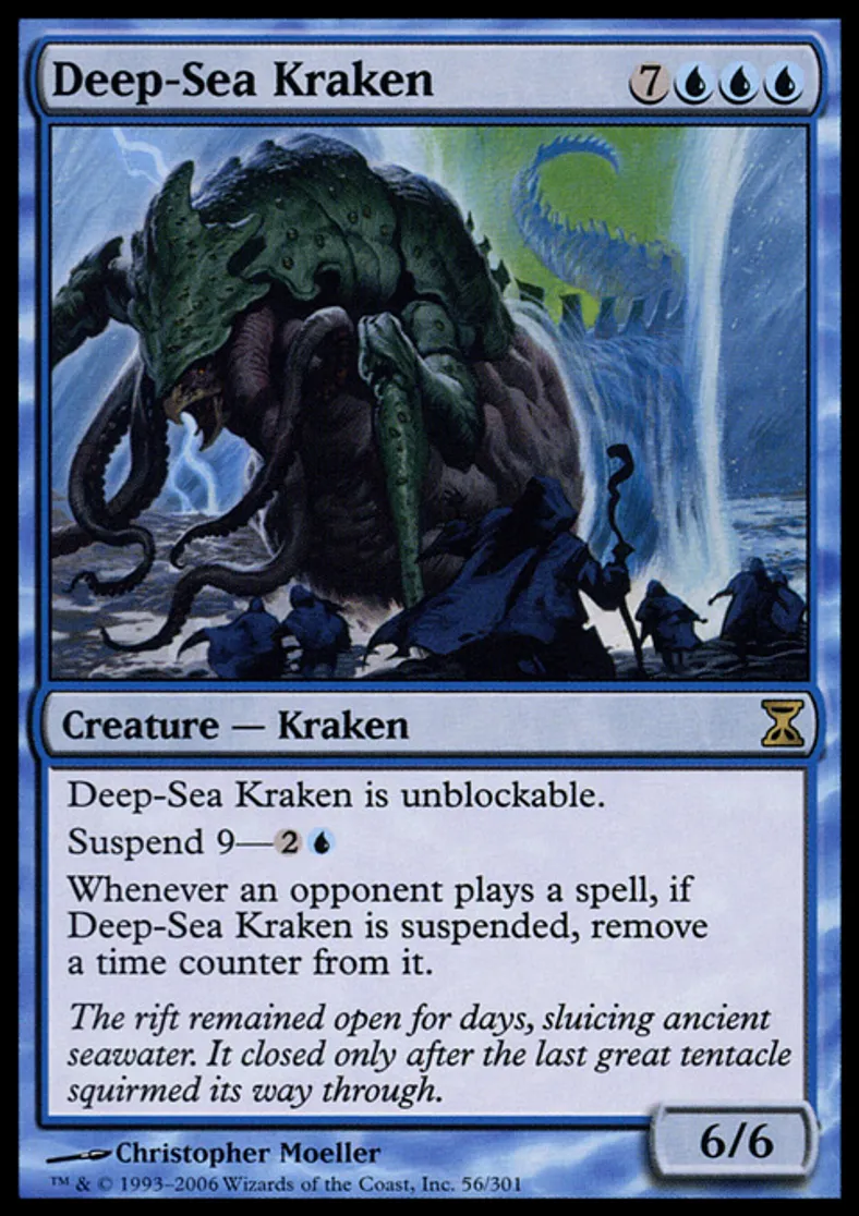 | Oracle Text | Deep-Sea Kraken is unblockable. Suspend 9—{{2}}{{u}} (Rather than cast this card from your hand, you may pay {{2}}{{u}} and exile it with nine time counters on it. At the beginning of your upkeep, remove a time counter. When the last is removed, cast it without paying its mana cost. It has haste.) Whenever an opponent casts a spell, if Deep-Sea Kraken is suspended, remove a time counter from it. | ||