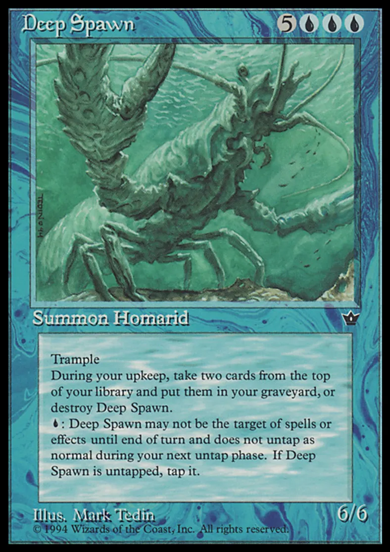 | Oracle Text | Trample At the beginning of your upkeep, sacrifice Deep Spawn unless you put the top two cards of your library into your graveyard. {{u}}: Deep Spawn gains shroud until end of turn and doesn't untap during your next untap step. Tap Deep Spawn. (A permanent with shroud can't be the target of spells or abilities.) | ||