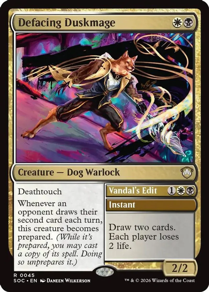 whenever an opponent draws their second card each turn, this creature becomes prepared. (while it's prepared, you may cast a copy of its spell. doing so unprepares it.) vandal's edit 1wb instant draw two cards. each player loses 2 life. | ||
