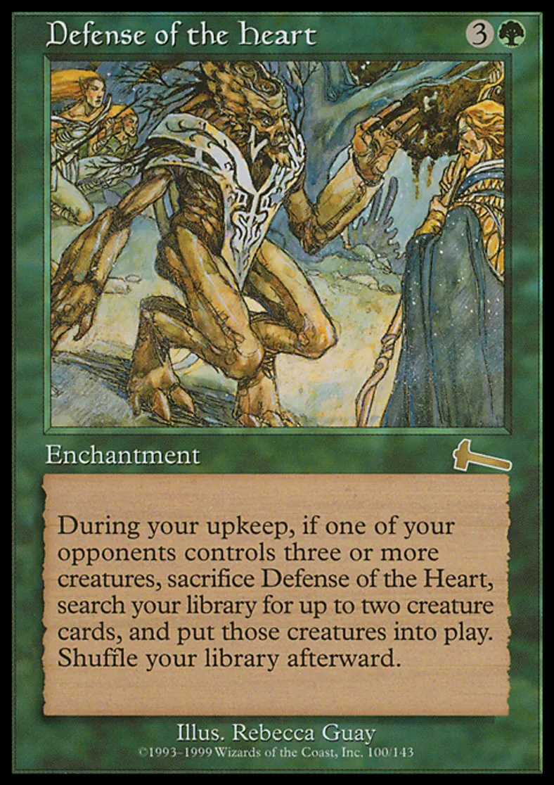 | Oracle Text | At the beginning of your upkeep, if an opponent controls three or more creatures, sacrifice Defense of the Heart, search your library for up to two creature cards, and put those cards onto the battlefield. Then shuffle your library. | ||