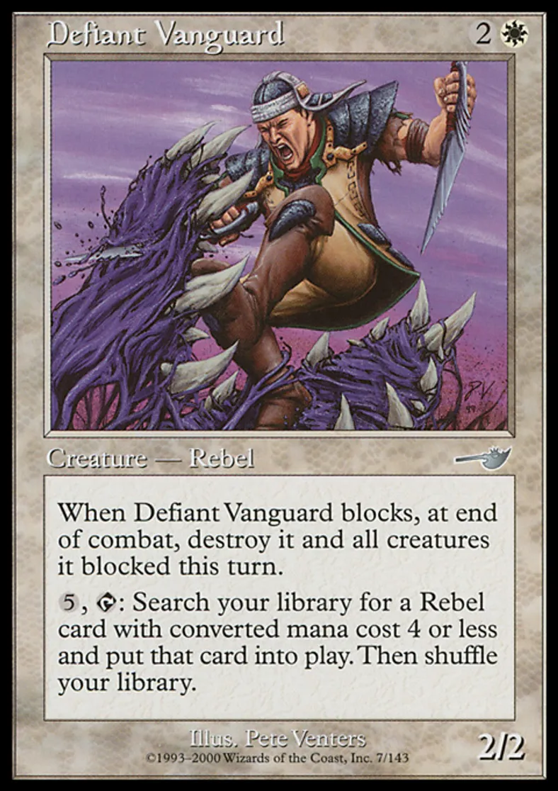| Oracle Text | When Defiant Vanguard blocks, at end of combat, destroy it and all creatures it blocked this turn. {{5}}, {{t}}: Search your library for a Rebel permanent card with converted mana cost 4 or less and put it onto the battlefield. Then shuffle your library. | ||