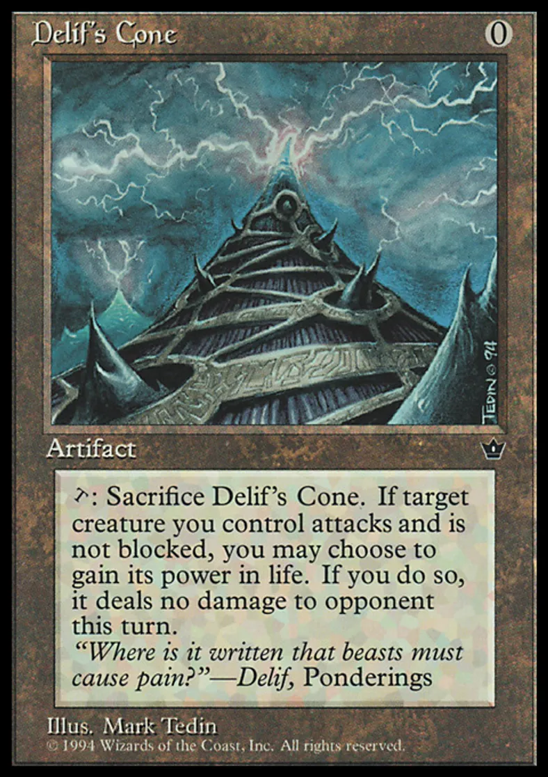 | Oracle Text | {{t}}, Sacrifice Delif's Cone: This turn, when target creature you control attacks and isn't blocked, you may gain life equal to its power. If you do, it assigns no combat damage this turn. | ||