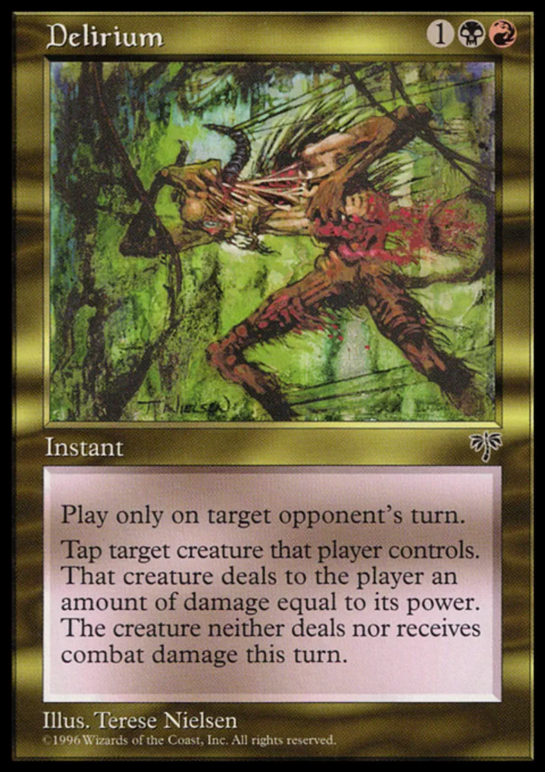| Oracle Text | Cast Delirium only during an opponent's turn. Tap target creature that player controls. That creature deals damage equal to its power to the player. Prevent all combat damage that would be dealt to and dealt by the creature this turn. | ||